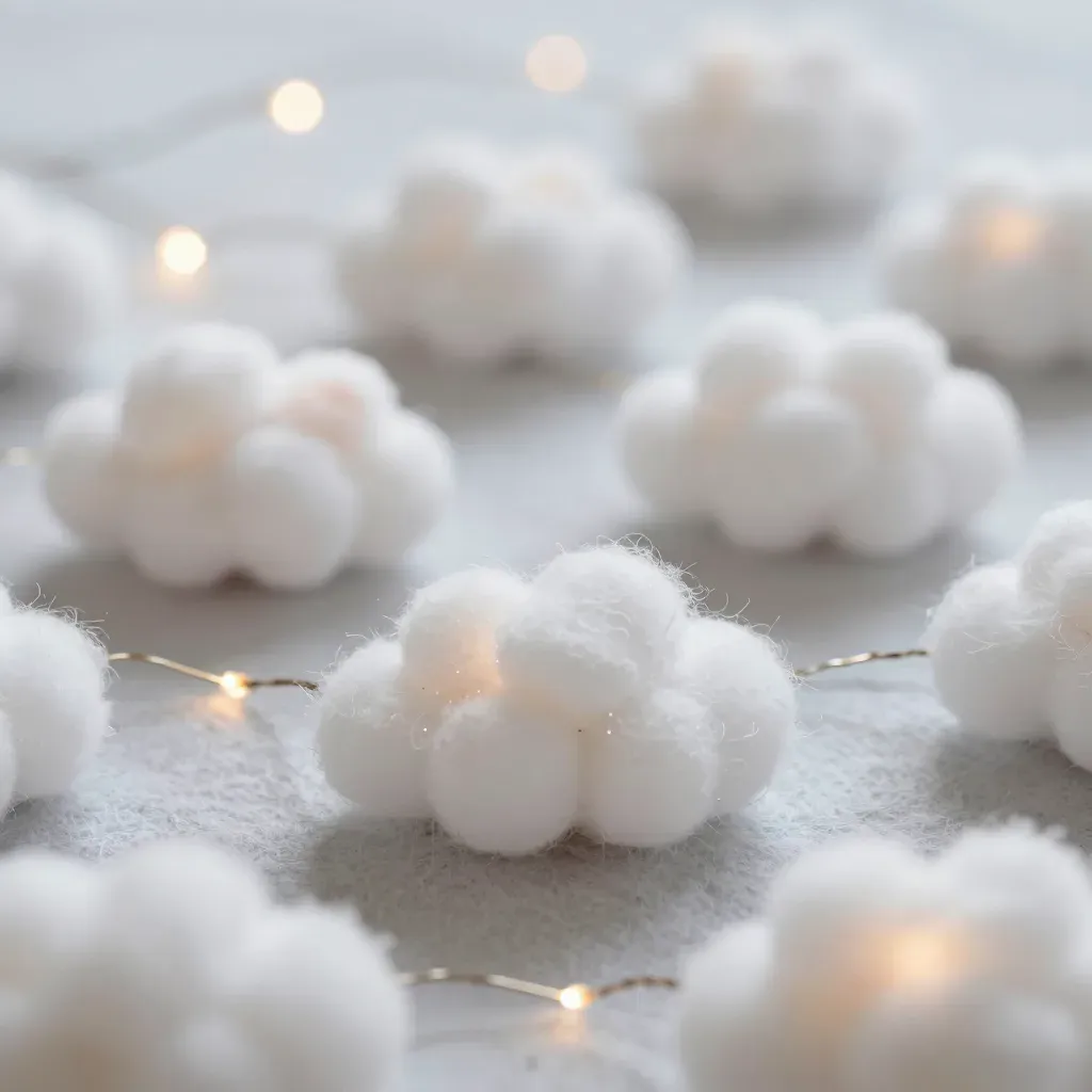 Close-up of fluffy cotton balls illuminated by warm ambient light, creating a halo effect. The shallow depth of field blurs the background, emphasizing the soft texture and delicate sheen of the cotton balls.