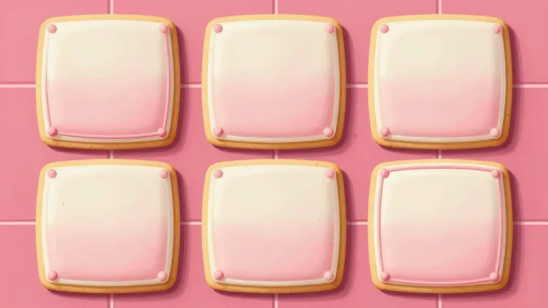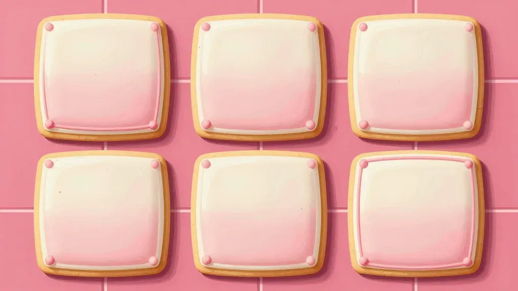 A symmetrical grid of iced biscuits with a smooth, glossy pink to white gradient and golden edges, set against a slightly blurred pink tiled backdrop. The soft, diffused lighting highlights the glossy surface, creating a clean and elegant composition.