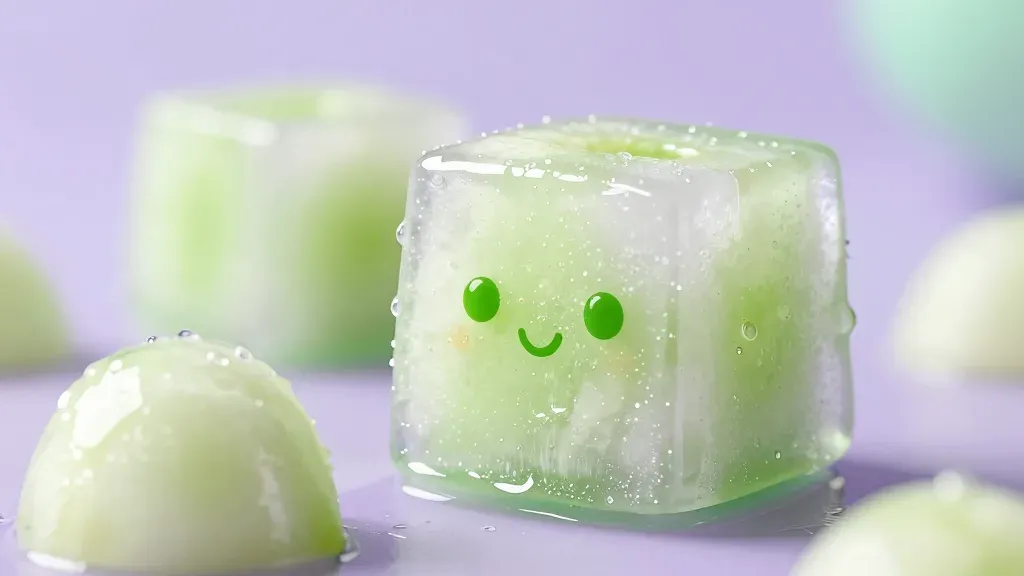 A close-up of a translucent honeydew ice block with green spheres resembling eyes, illuminated by soft, diffused light that highlights its glossy surface and creates a shallow depth of field, blurring the background for a clean and simple backdrop.