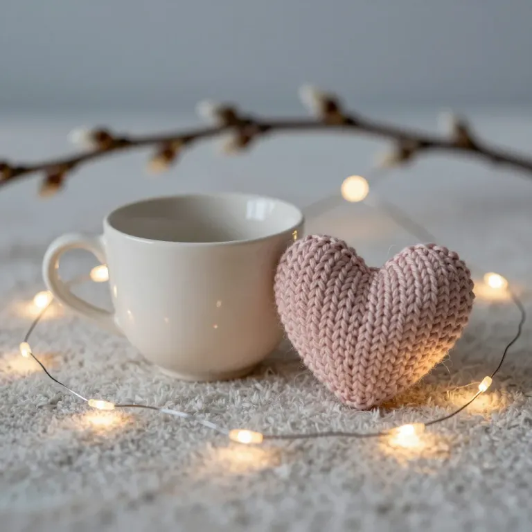 A white teacup and knitted pink heart are softly illuminated by string lights, creating a cozy and inviting atmosphere. The composition is framed by delicate branch and string lights, enhancing the scene's warmth and tranquility.