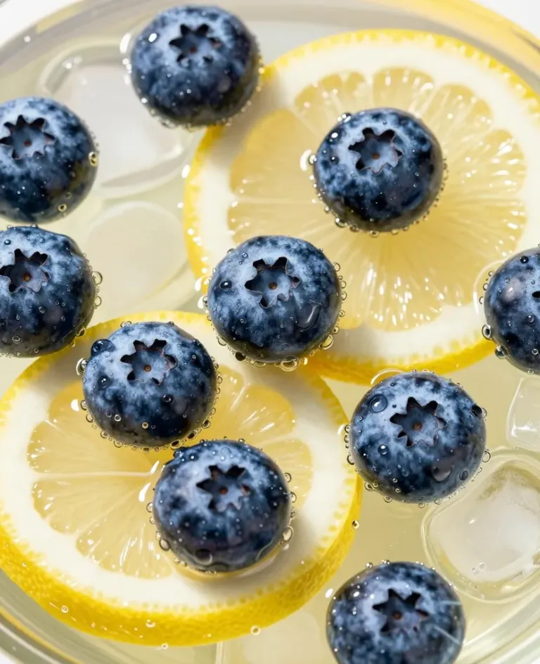 Fresh blueberries and translucent lemon slices rest in a clear glass with subtle condensation, their waxy and fibrous textures highlighted by soft, diffused natural light. The shallow depth of field and close-up overhead angle emphasize the circular arrangement, creating a clean, minimalist composition with a blurred background of liquid and faint bubbles.