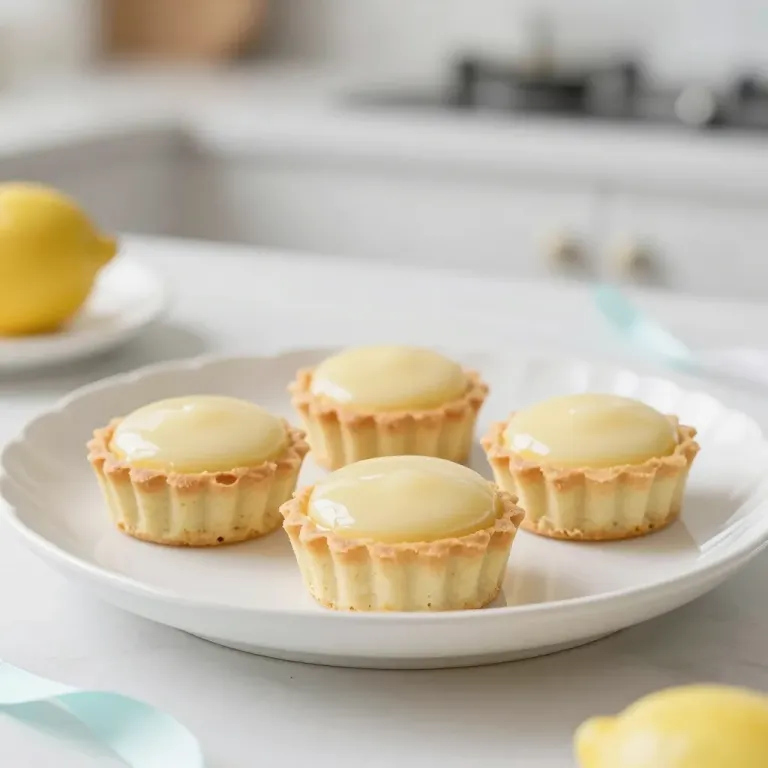Crispy tartlets with creamy, glossy filling are arranged on white plates, illuminated by soft, natural light that highlights the golden crust and smooth texture. The shallow depth of field and clean background create a focused, inviting atmosphere.