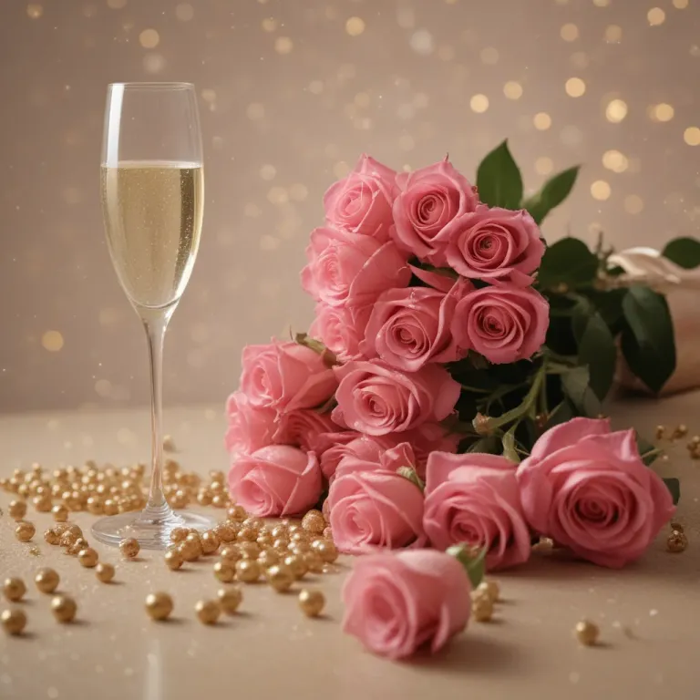 A glass of champagne and a bouquet of soft pink roses are elegantly arranged, with warm golden light highlighting the textures and creating a festive atmosphere. The blurred background with bokeh effect adds depth and a sense of celebration.