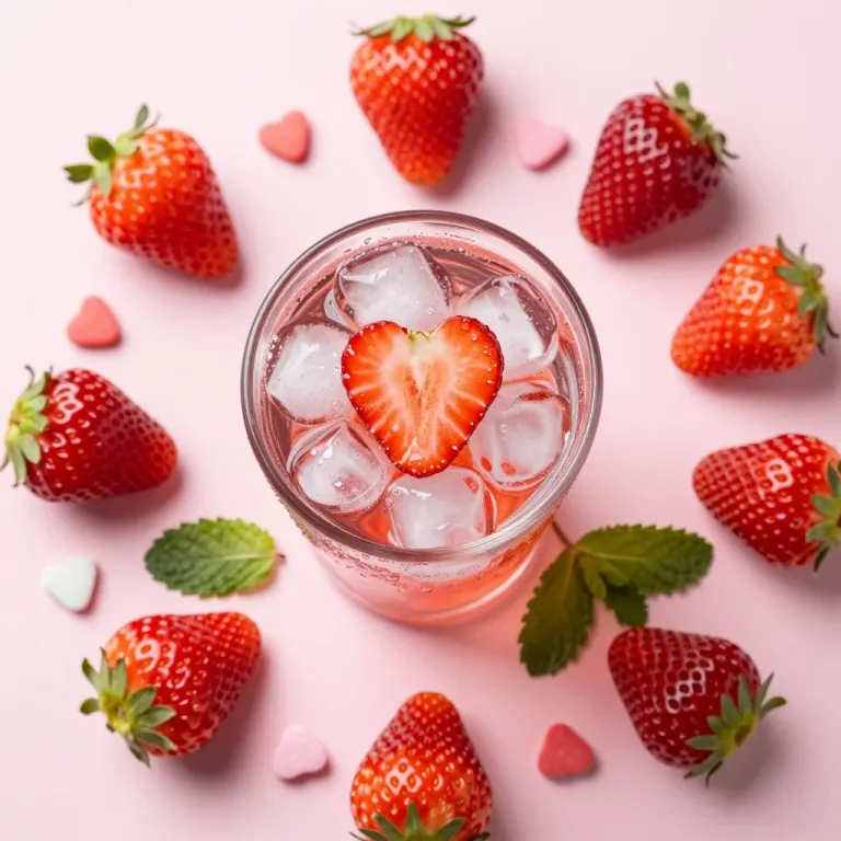 A glass of mocktail is garnished with a heart-shaped strawberry slice, surrounded by ice cubes and mint leaves, set against a soft pink background. The direct overhead lighting highlights the glossy texture of the strawberries and the clarity of the drink, creating a clean and focused composition.