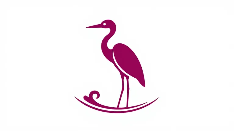 A magenta heron stands gracefully on a glossy, reflective waterline, creating gentle reflections and subtle shadows. The minimalist white background and slightly blurred waterline provide ample copy space for design integration.