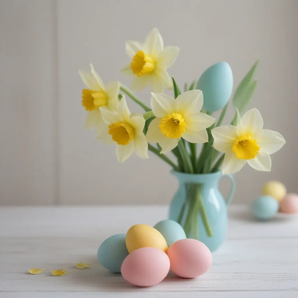 A bouquet of soft, pastel-colored daffodils and glossy eggs arranged in a blue vase, bathed in soft, diffused light that highlights the delicate textures and vibrant colors. The shallow depth of field and clean white wooden background provide a serene and elegant backdrop, ideal for spring or Easter-themed designs.