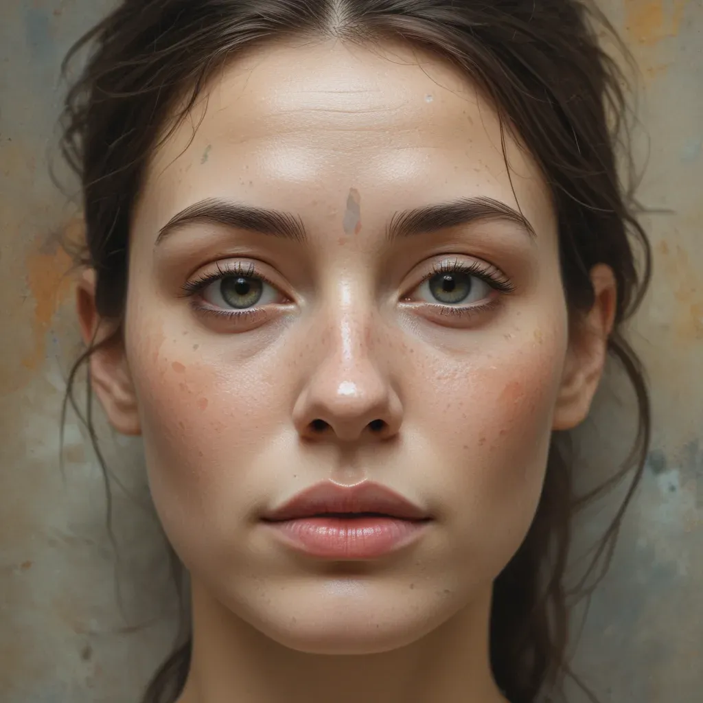 A close-up of a person with freckles and natural skin texture, illuminated by diffused lighting that creates gentle highlights and soft shadows. The textured wall background, slightly blurred, enhances the subject's prominence.