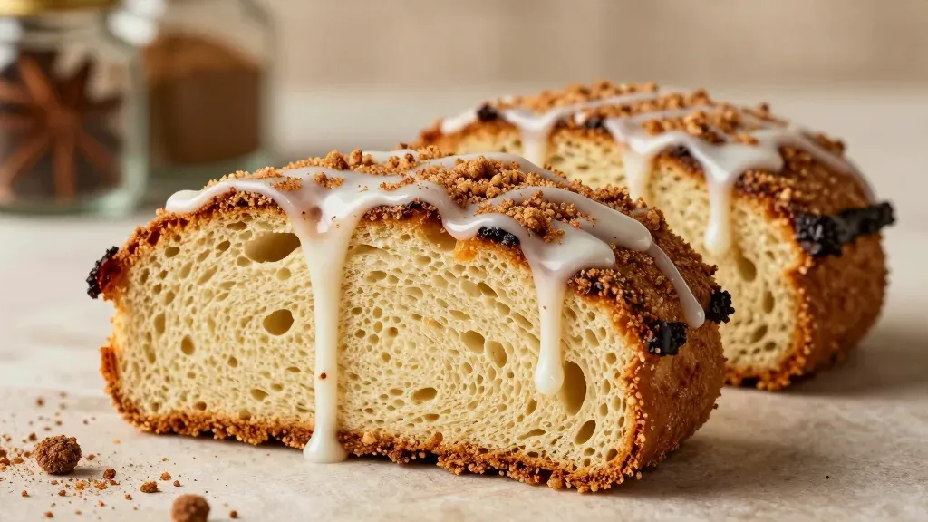 A close-up of a sliced brioche cake with raisins and glossy icing, bathed in soft natural light that highlights the cake's airy texture and golden hue. The blurred background with cinnamon and spices adds a cozy, rustic ambiance.