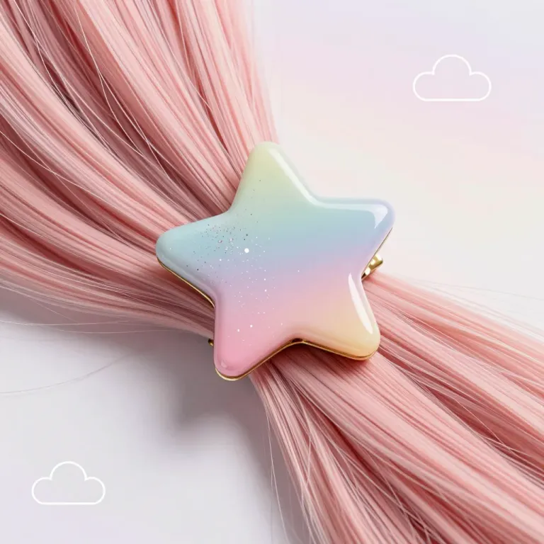 A close-up of a glossy, star-shaped hair clip in pastel shades, softly lit to highlight its reflective surface. The minimalistic background ensures the focus remains on the clip and the vibrant hair it adorns.
