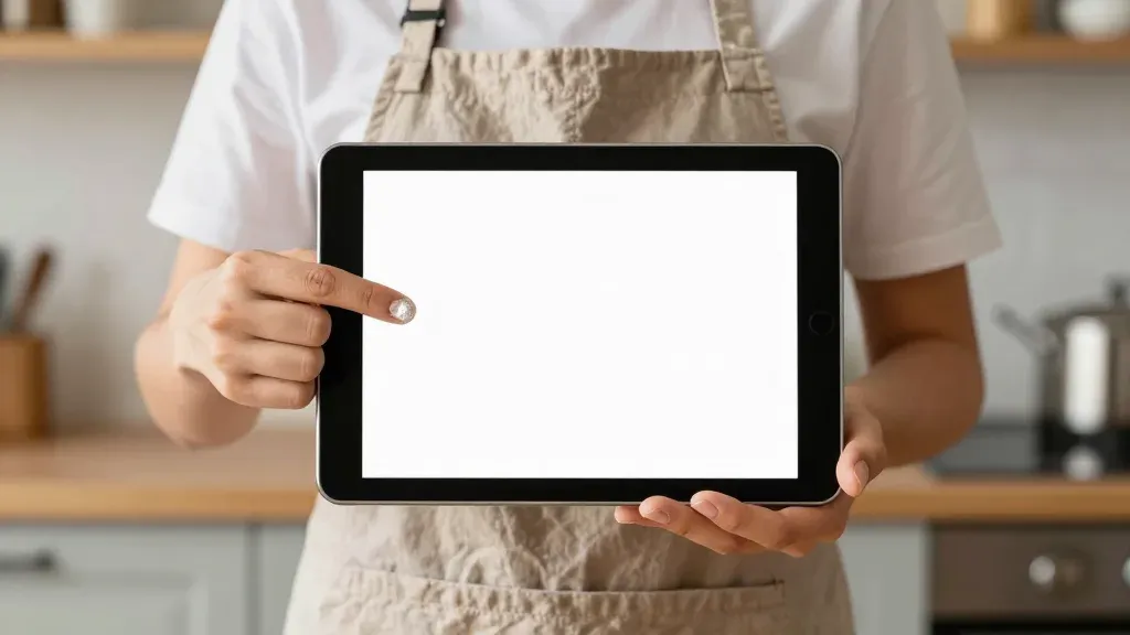 A person in a beige apron holds a tablet with a glossy white screen, with soft natural light reflecting off the screen. The background, slightly blurred, shows a kitchen with wooden countertops and a hint of a pot on the stove, creating a shallow depth of field.
