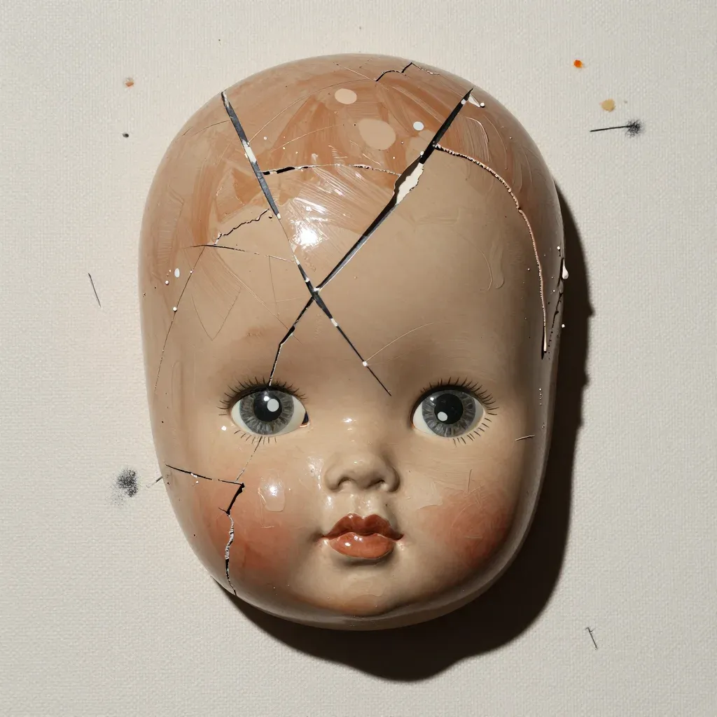 A close-up of an antique doll's head with glossy, cracked paint and peeling layers, illuminated by dim, directional light that highlights the texture and reflections. The neutral, plain background slightly blurs to emphasize the doll's head, creating a shallow depth of field.