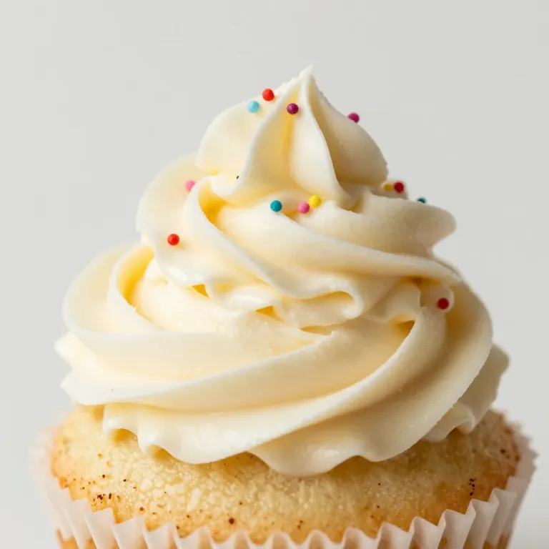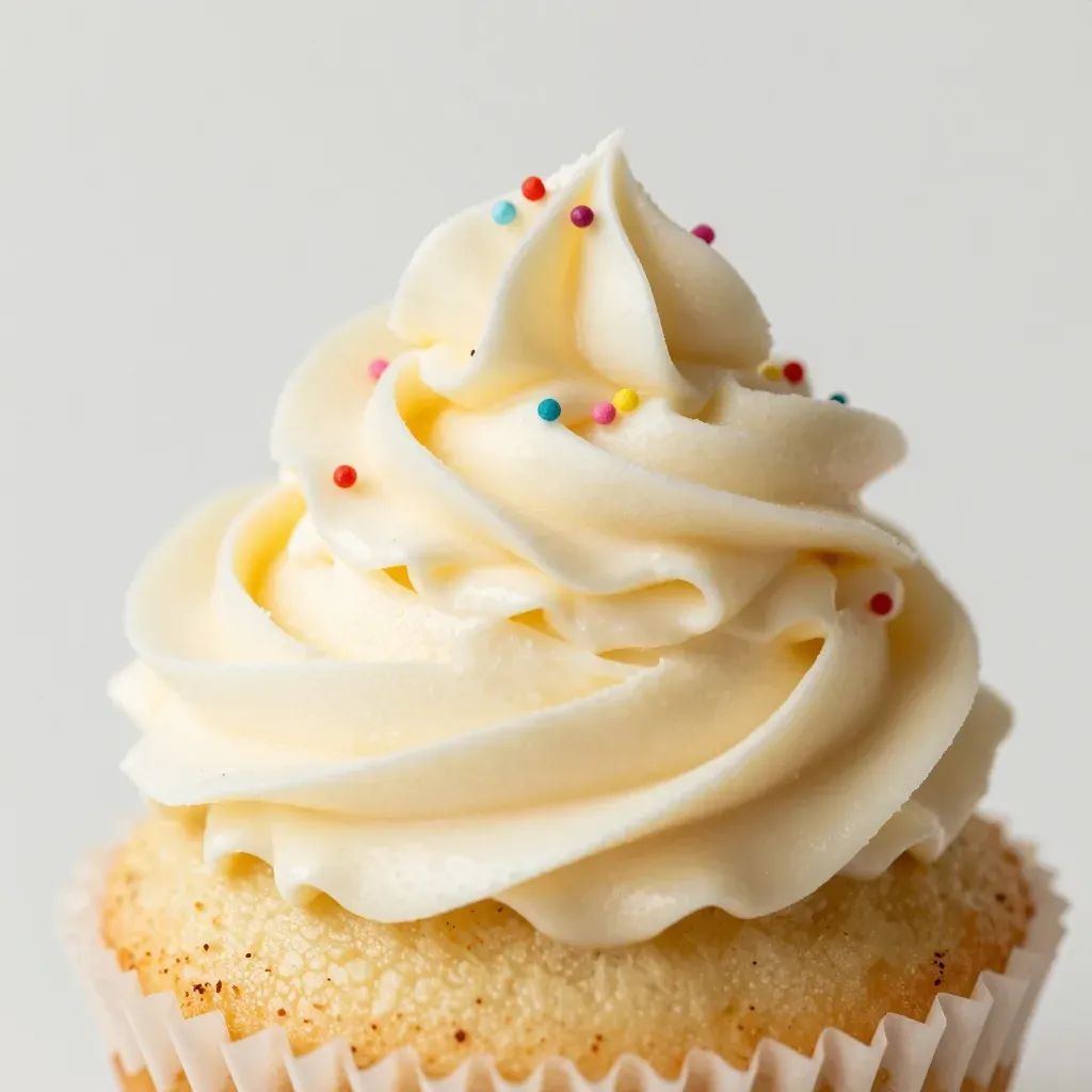 A close-up of a vanilla cupcake with swirled frosting and colorful sprinkles, highlighted by soft, diffused lighting that emphasizes the texture and color of the frosting. The blurred, neutral white background ensures the cupcake remains the focal point.