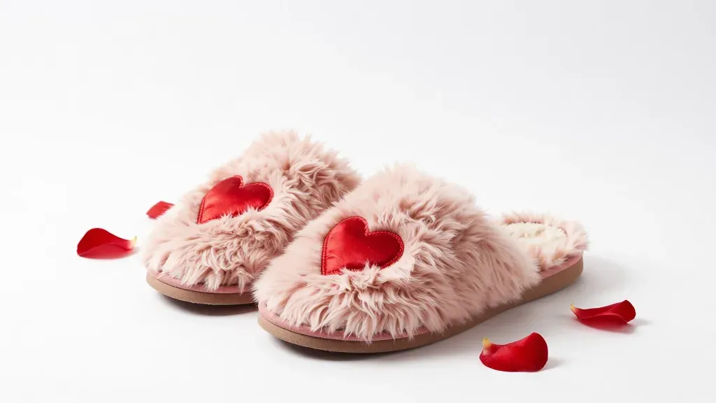 A close-up of a soft, fluffy faux-fur slipper pair adorned with red petals, set against a clean, white background. The diffused lighting highlights the textures and shadows, creating a cozy and inviting atmosphere.