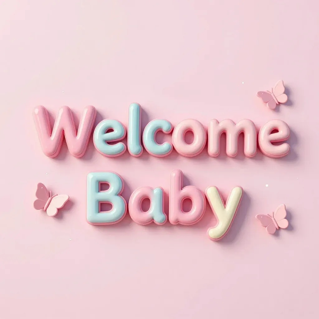 Glossy, pastel-colored text spelling 'Welcome Baby' with translucent butterflies, set against a soft pink background. The gentle lighting and symmetrical composition create a harmonious and inviting design.