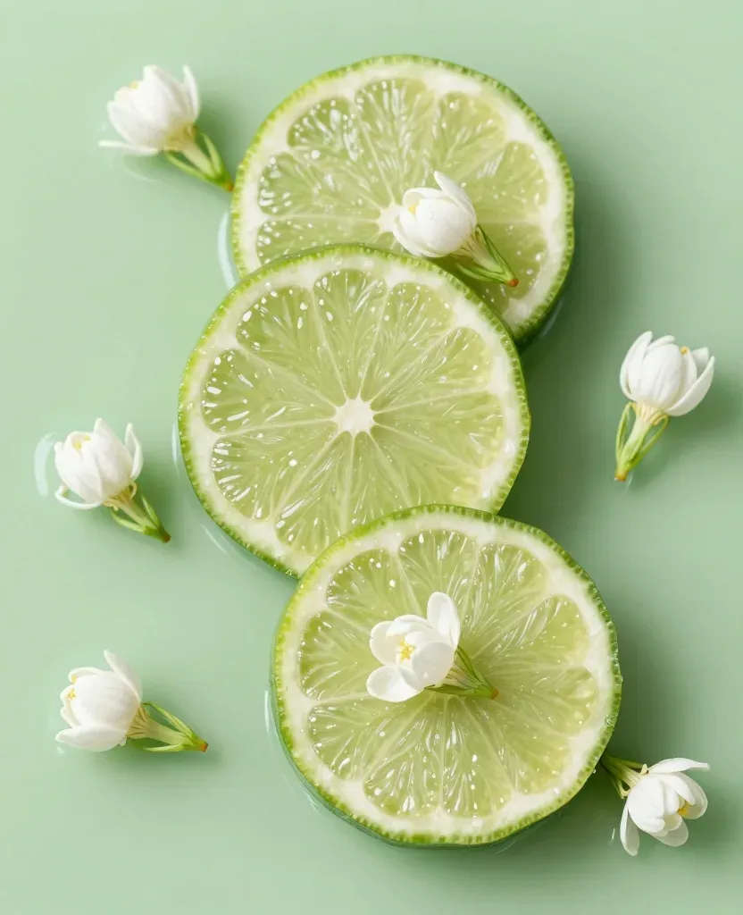 Sliced limes and delicate jasmine flowers are arranged in a circular pattern, illuminated by soft, diffused light that highlights their textures and vibrant colors. The pale green background provides a clean and simple backdrop, allowing the limes and flowers to stand out.