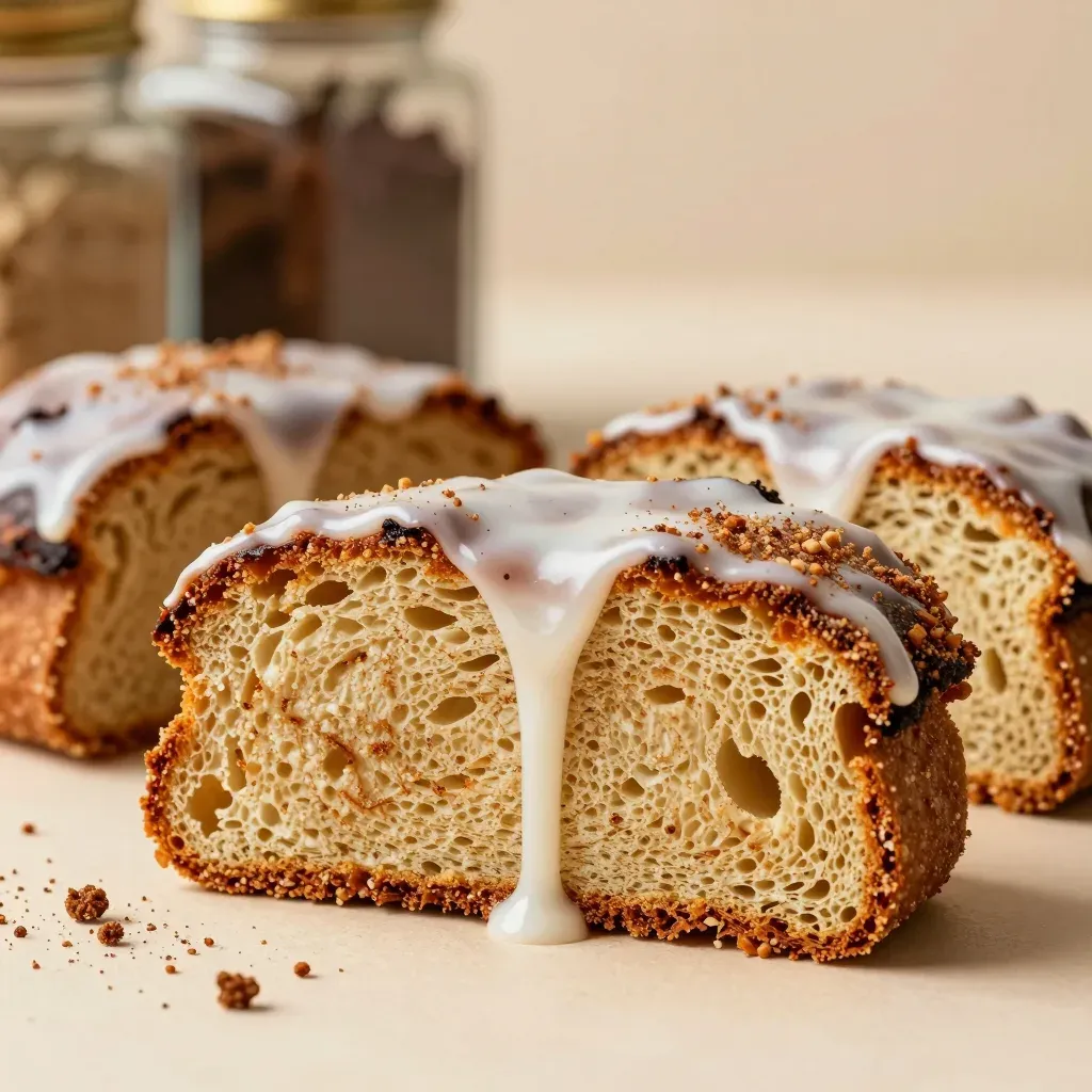A close-up of a golden-brown brioche loaf sliced and drizzled with creamy icing, highlighting its airy texture and glossy finish under soft, diffused lighting. The neutral beige background and blurred jars in the background keep the focus on the bread, providing a clean and minimalistic setting.
