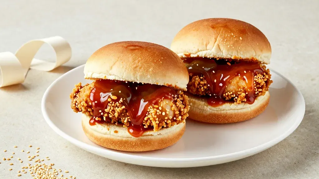 Two golden-brown crispy chicken sandwiches topped with glossy ketchup are presented on a white plate, with soft buns and scattered sesame seeds enhancing the visual texture. The image features soft directional lighting from the upper left, shallow depth of field focusing on the front sandwich, and a clean neutral background with subtle copy space.
