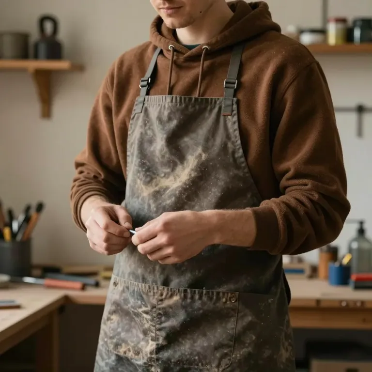 A craftsman wearing a dusty apron and brown hoodie carefully handles a small object, illuminated by soft, diffused light. The slightly blurred background of a workshop setting with tools and shelves adds depth and context to the image.