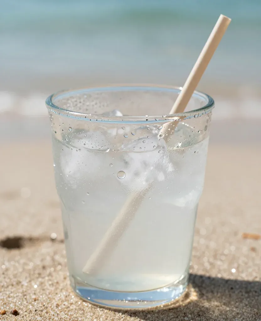 A glass of sparkling water with ice cubes and a straw is placed on a sandy beach, bathed in warm, golden sunlight that highlights the clarity of the drink and the texture of the ice. The soft focus on the background emphasizes the refreshing drink in the foreground, creating a serene and inviting scene.