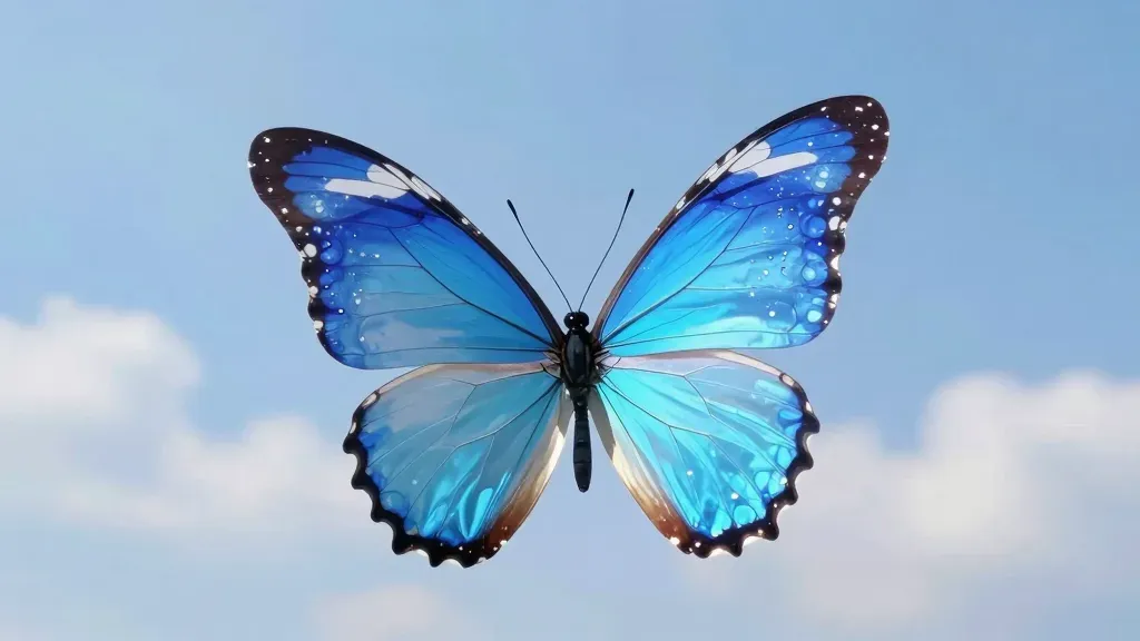 A blue butterfly with iridescent wings is centered against a soft, diffused light sky, highlighting the wings' shimmering texture. The blurred background of light blue sky and white clouds provides a clean, shallow depth of field, ideal for design elements.