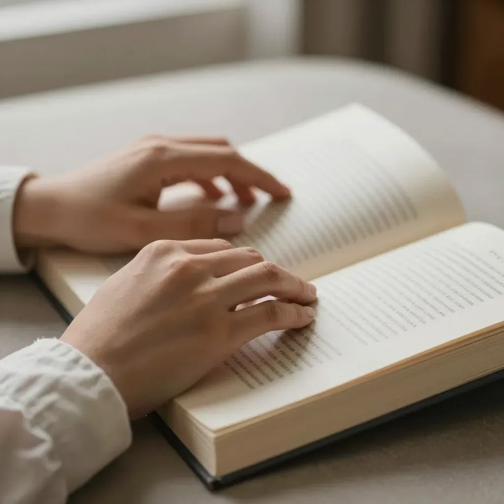 A pair of hands gently placed on an open book, fingers hovering over embossed text on smooth, aged paper, with soft fabric cuffs visible. Soft natural light from the left creates subtle highlights and gentle shadows, with a shallow depth of field isolating the hands and book against a blurred neutral background.