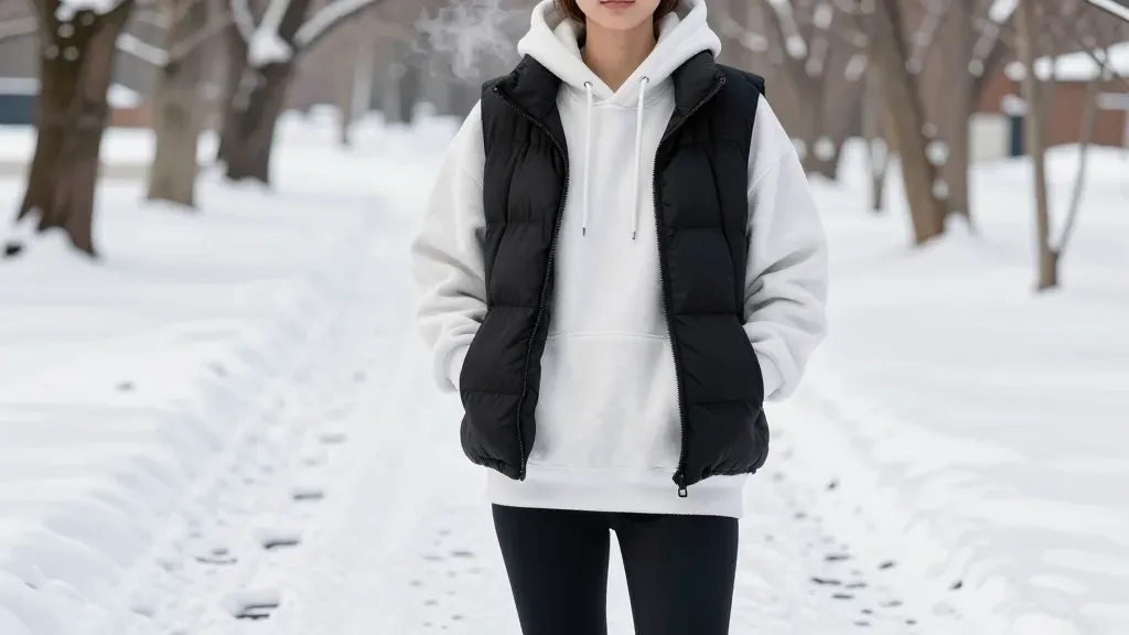 A person stands on a snow-covered path, wearing a fluffy white hoodie and a glossy black puffer vest, with soft, diffused light creating gentle shadows and highlights. The shallow depth of field blurs the background, emphasizing the subject and creating a sense of depth and isolation.