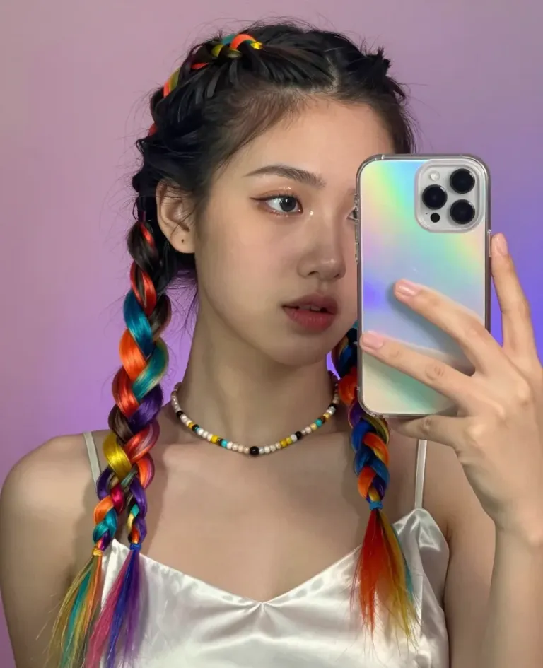 A young woman with vibrant multicolored braids and a holographic phone case takes a selfie, illuminated by soft, diffused light that highlights her glossy hair and the pastel purple background. The clean, blurred backdrop ensures the subject stands out.
