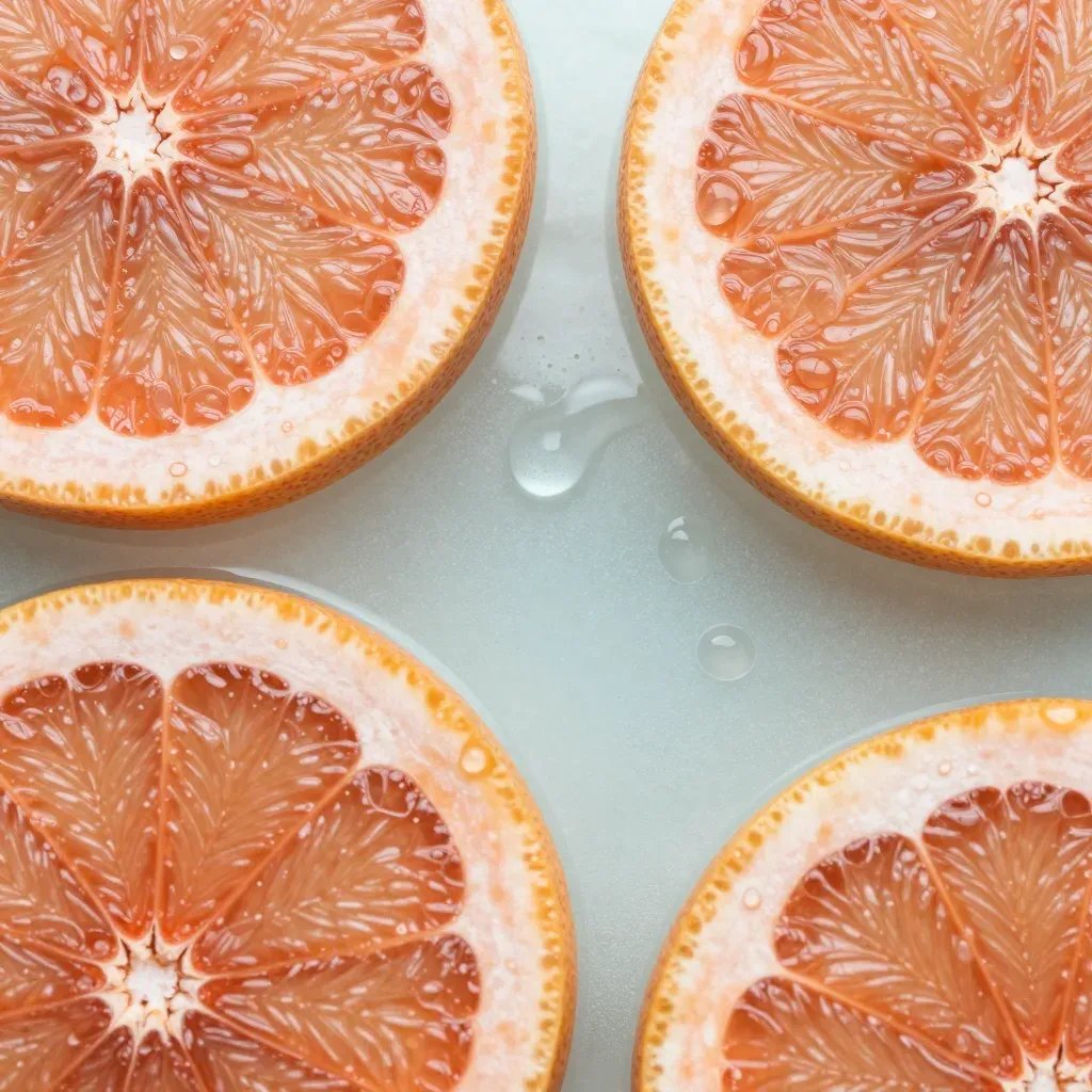 Close-up of vibrant grapefruit halves showcasing intricate vein patterns and a dewy, glossy texture. The soft, diffused lighting highlights the fruit's natural beauty against a clean, white background, creating a visually striking and versatile image.