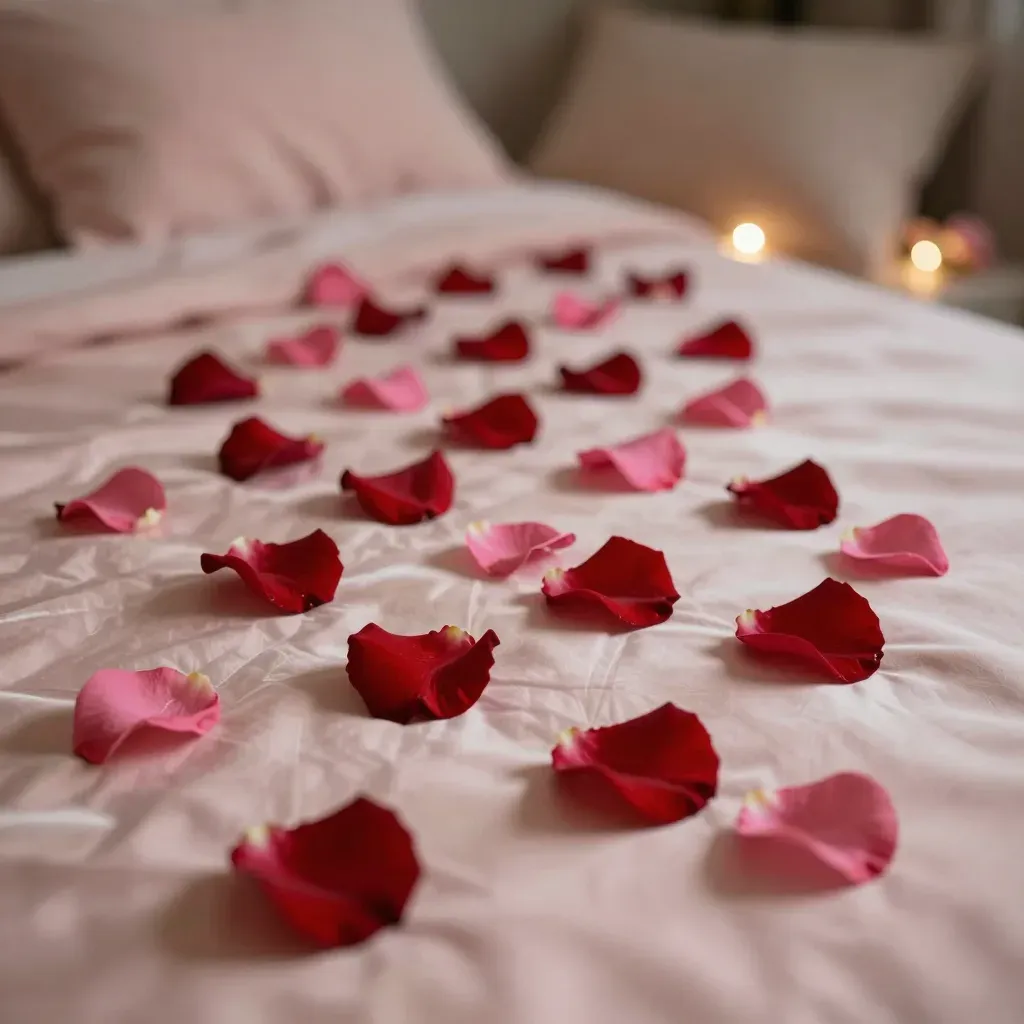 Glossy rose petals are artfully arranged in a curved pathway on a soft, white bedspread, illuminated by warm ambient light that highlights their delicate texture and vibrant colors. The blurred background of pillows and string lights enhances the cozy, romantic ambiance of the scene.