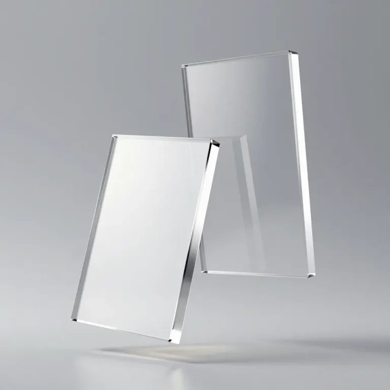 Two translucent acrylic blocks drift in soft, diffused light, creating highlights and reflections. The clean, white background emphasizes the blocks' smooth texture and subtle color palette.