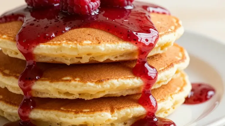 A close-up of a stack of fluffy pancakes topped with glossy raspberry coulis, highlighting the textures and vibrant colors under soft, diffused lighting. The blurred background ensures the focus remains on the appetizing dish, making it ideal for culinary and food photography.