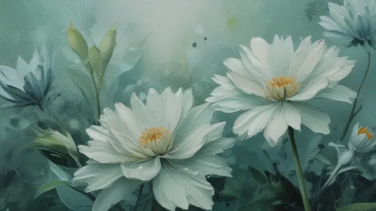 Softly glowing white flowers with yellow centers and textured impasto brushstrokes, set against a blurred, light green background, creating a serene and atmospheric composition. The diffused lighting enhances the delicate details and adds depth to the scene.