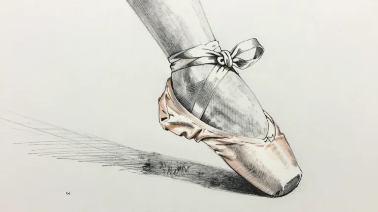 A close-up of a ballet dancer's foot en pointe, clad in a creased and slightly frayed satin pointe shoe with a glossy ribbon tied around the ankle, rendered in fine graphite with subtle warm undertones in the toe box. Soft directional lighting from the upper left creates gentle highlights and a long shadow, while the minimalist off-white background with faint smudges provides clean, uncluttered framing.