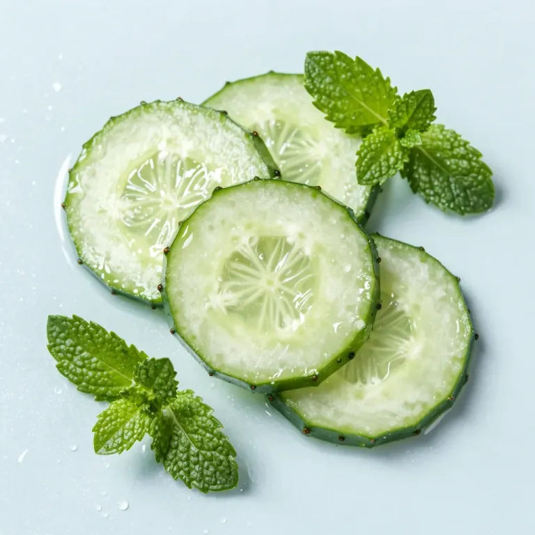Freshly sliced cucumbers and mint leaves are arranged on a pale, cool-toned surface, highlighting their crisp texture and vibrant green hues. The soft, diffused lighting enhances the freshness and natural beauty of the ingredients, making this image ideal for culinary or health-related content.