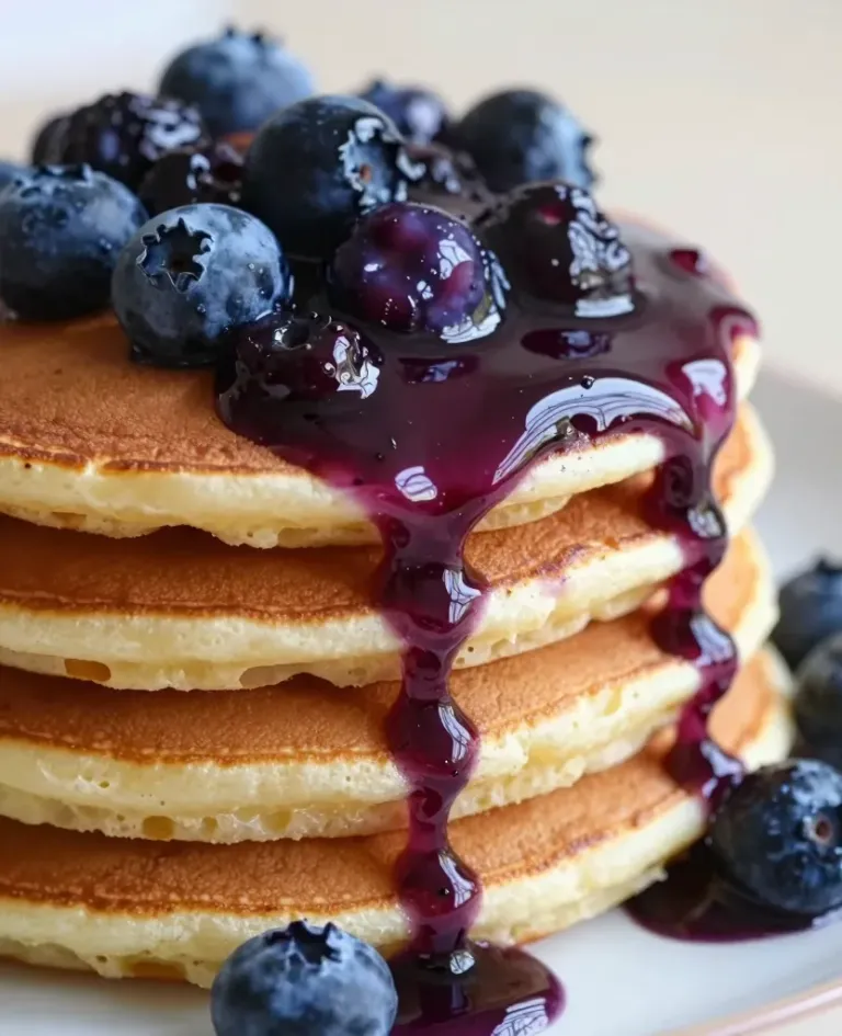A close-up of a stack of golden pancakes topped with glossy blueberry compote, softly lit from above to highlight the textures and colors, with a shallow depth of field blurring the background and emphasizing the main subject.