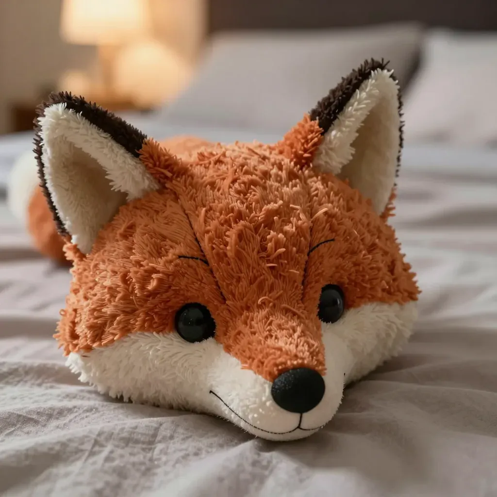 A close-up of a soft, textured plush fox toy resting on a white blanket, illuminated by warm, golden light from a nearby lamp, creating a cozy and inviting ambiance. The shallow depth of field draws attention to the toy's detailed features and the soft shadows it casts.