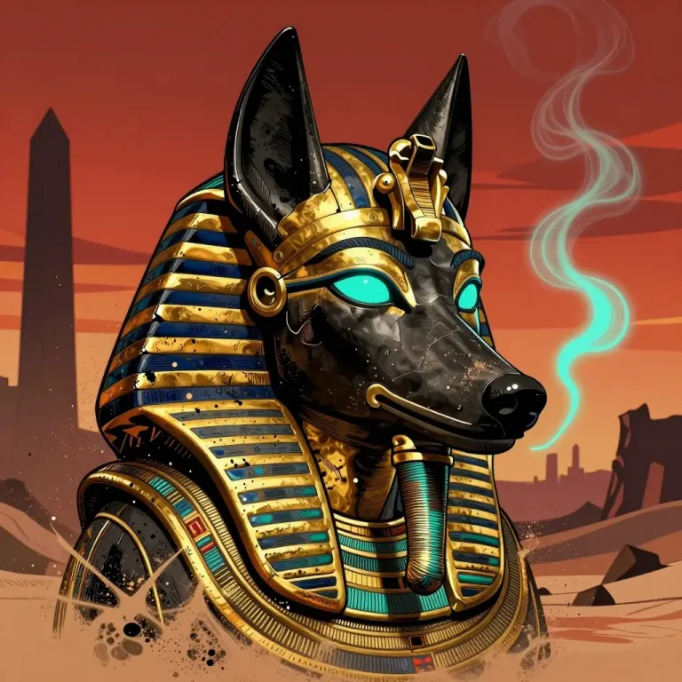 A jackal-headed pharaoh adorned in glossy gold and blue hieroglyphic patterns stands in a desert landscape, bathed in the warm glow of a setting sun. The composition emphasizes the pharaoh as the central subject, with a blurred background featuring an obelisk and sandy terrain.