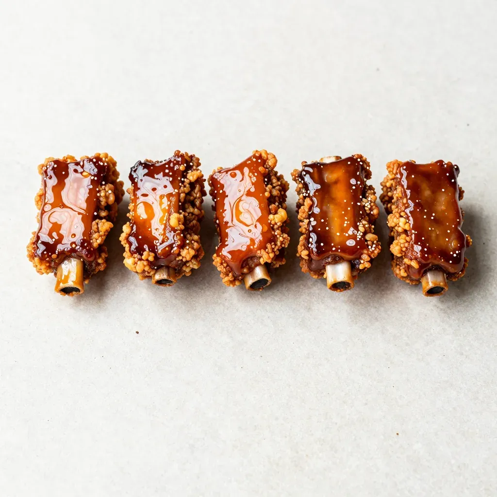 Five baby back ribs arranged in a horizontal line, each coated in a glossy, viscous glaze and topped with a coarse, granular crust, revealing tender meat at the ends. Soft overhead lighting creates subtle highlights on the glaze, with a shallow depth of field and a clean, uniform off-white background providing ample copy space.