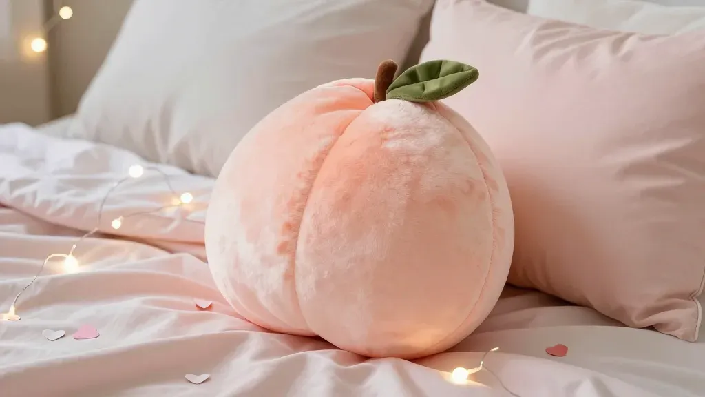 A plush peach with soft, velvety texture and glossy finish rests on a white bed, illuminated by warm string lights, creating a cozy and inviting atmosphere. The shallow depth of field draws attention to the plush, making it the focal point of the image.