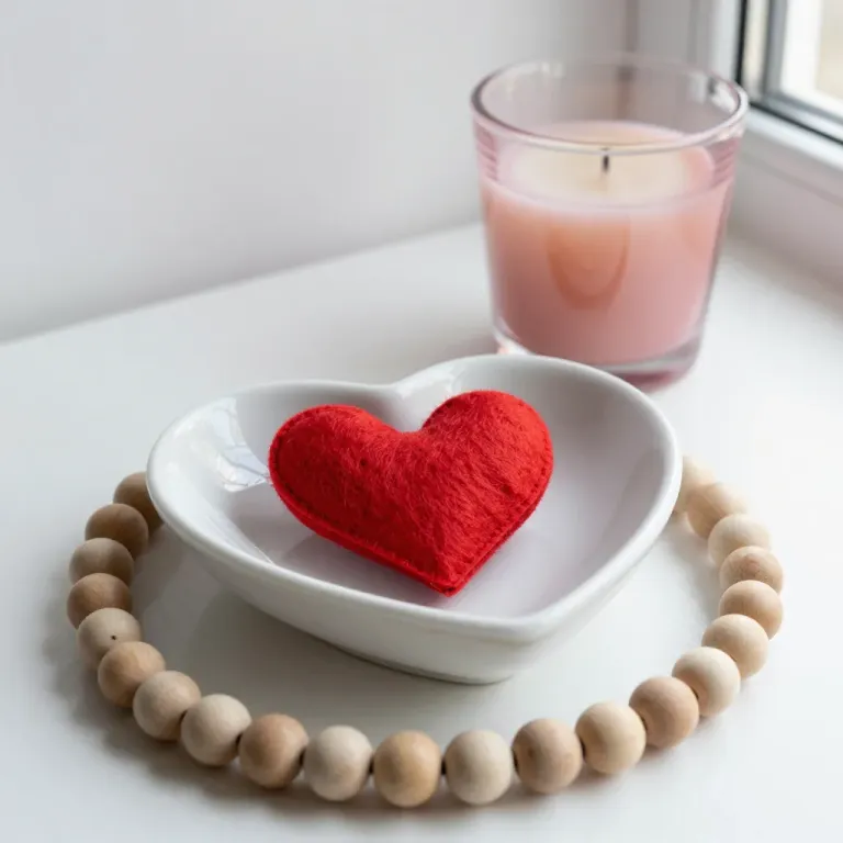 A red felt heart rests in a glossy white ceramic dish, encircled by natural wooden beads, with a pink candle softly glowing in the background. Diffused natural light from the right creates soft highlights on the ceramic and glass, while a shallow depth of field isolates the heart dish as the focal point against a minimalist white surface.