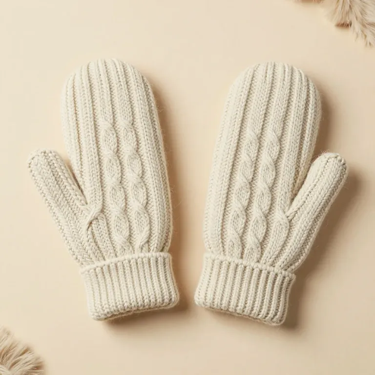 Cream cable-knit mittens are displayed against a soft, even light that highlights their intricate texture and natural sheen. The neutral beige background provides a clean and unobtrusive backdrop, emphasizing the mittens' design and craftsmanship.