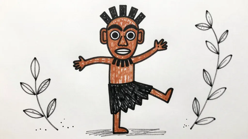 A mask dancer with one arm raised stands in a textured outfit, set against a soft, diffused light that highlights the dancer and mask. The simple, stylized jungle leaves and branches in the background are slightly blurred, emphasizing the dancer as the central focus.