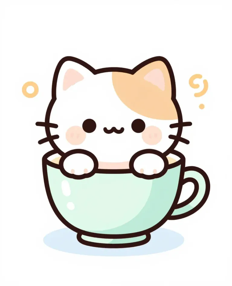 A soft, fluffy kitten nestles comfortably in a pastel green teacup, highlighted by diffused, soft lighting that accentuates its fur and the glossy teacup. The minimal, light gray background ensures the focus remains on the intimate and warm scene.