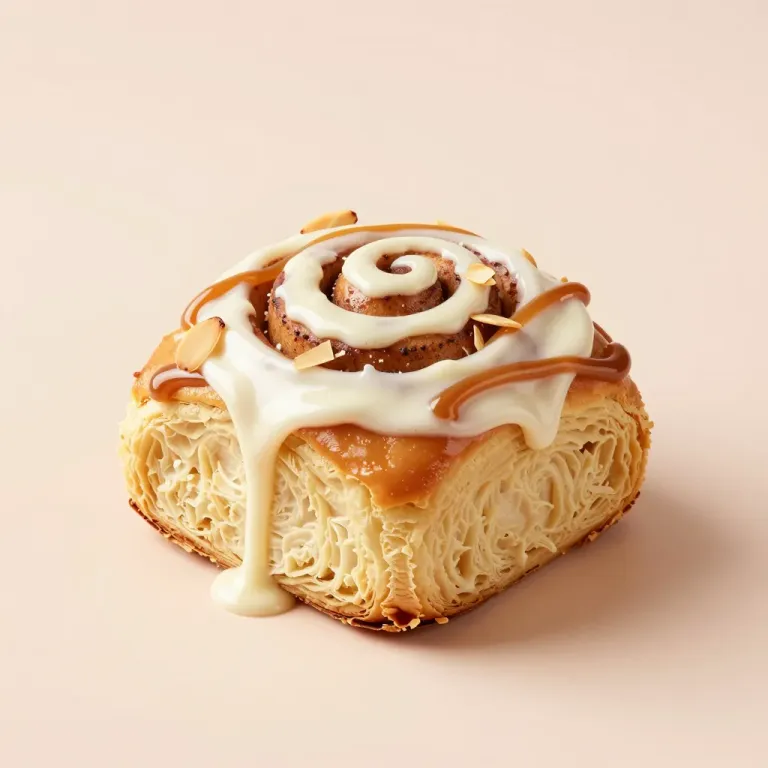 A close-up of a golden-brown almond-icing twist bun, glossy icing, and smooth caramel drizzle, highlighted by soft, diffused lighting that emphasizes the intricate pastry details. The neutral, blurred background ensures the focus remains on the delectable treat.
