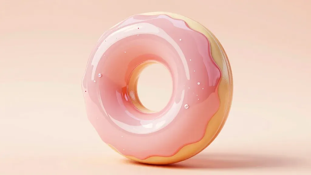 A glossy pink glaze covers a donut ring, creating a smooth, liquid-like texture. Diffused warm light from above highlights the donut's surface, casting soft shadows and emphasizing its three-dimensional form against a blurred peach-toned background.