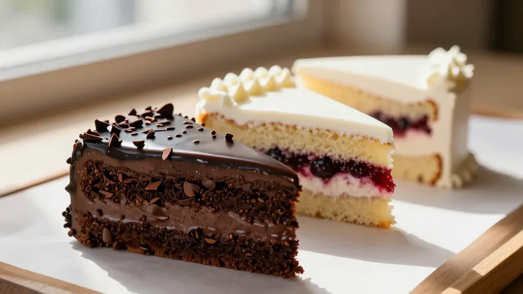 Slices of decadent chocolate and white cream cheese cakes with vibrant blueberry filling, presented in a close-up shot with soft, natural light enhancing the glossy chocolate ganache and fluffy cake layers. The shallow depth of field blurs the background, focusing attention on the textures and layers of the cakes, suggesting a cozy indoor setting, possibly a bakery or café.
