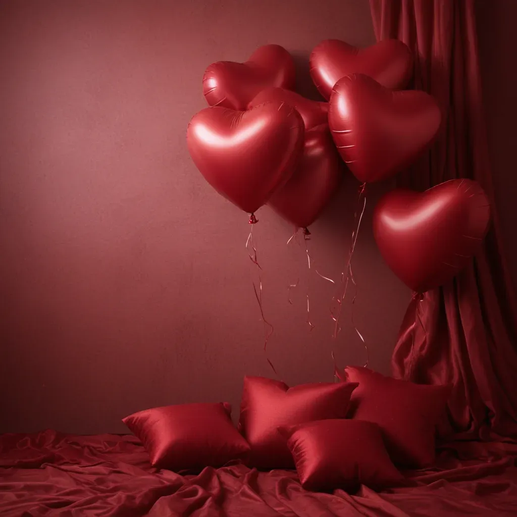 Glossy heart-shaped balloons rest on a bed draped in velvety crimson silk, illuminated by soft, diffused light that creates a warm, inviting glow. The dark, blurred curtains in the background add depth and contrast, framing the scene with a clean, elegant composition.