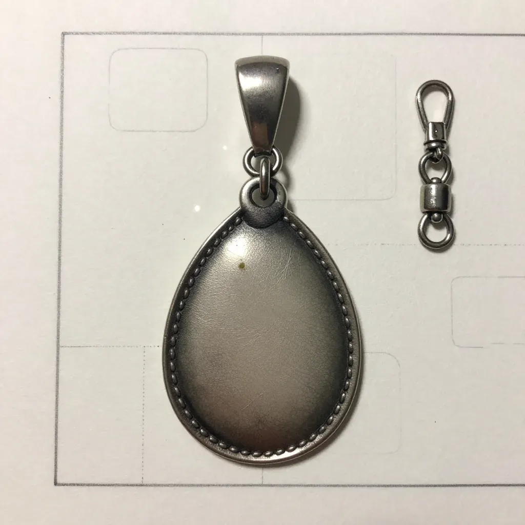 A teardrop-shaped pendant with intricate bead-stitching and a small metallic clasp, highlighted by reflective directional lighting. The clean white background with grid lines emphasizes the subject and provides ample copy space.