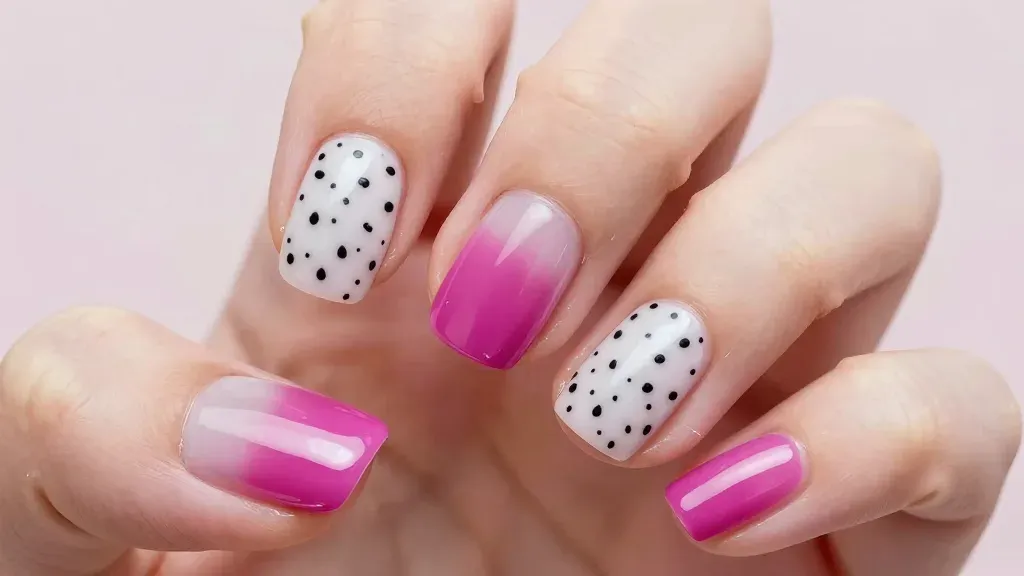 Close-up of fingers showcasing intricately designed nails with a glossy white base, black polka dots, and a pink gradient, illuminated by soft, diffused light that highlights the texture and depth of the design. The subtle, light pink background ensures the focus remains on the detailed nail art, providing ample copy space for design elements.
