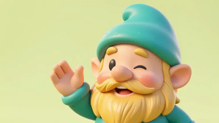 A close-up of a garden gnome with a teal hat and golden-yellow hair, winking under soft, diffused lighting that highlights the gnome's features and creates gentle shadows. The shallow depth of field blurs the background, focusing attention on the gnome's face and hat against a soft, pastel yellow backdrop.
